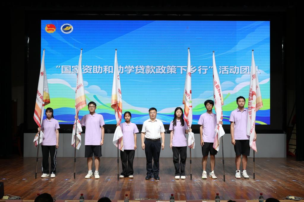 仪式在回顾2024年社会实践丰硕成果的视频中拉开序幕。杨洲为2025年出征团队学生代表授旗。本年度重点组建的“国家资助和助学贷款政策下乡行”团队、校级“百千万工程”突击队接过象征使命与担当的旗帜,整装待发。